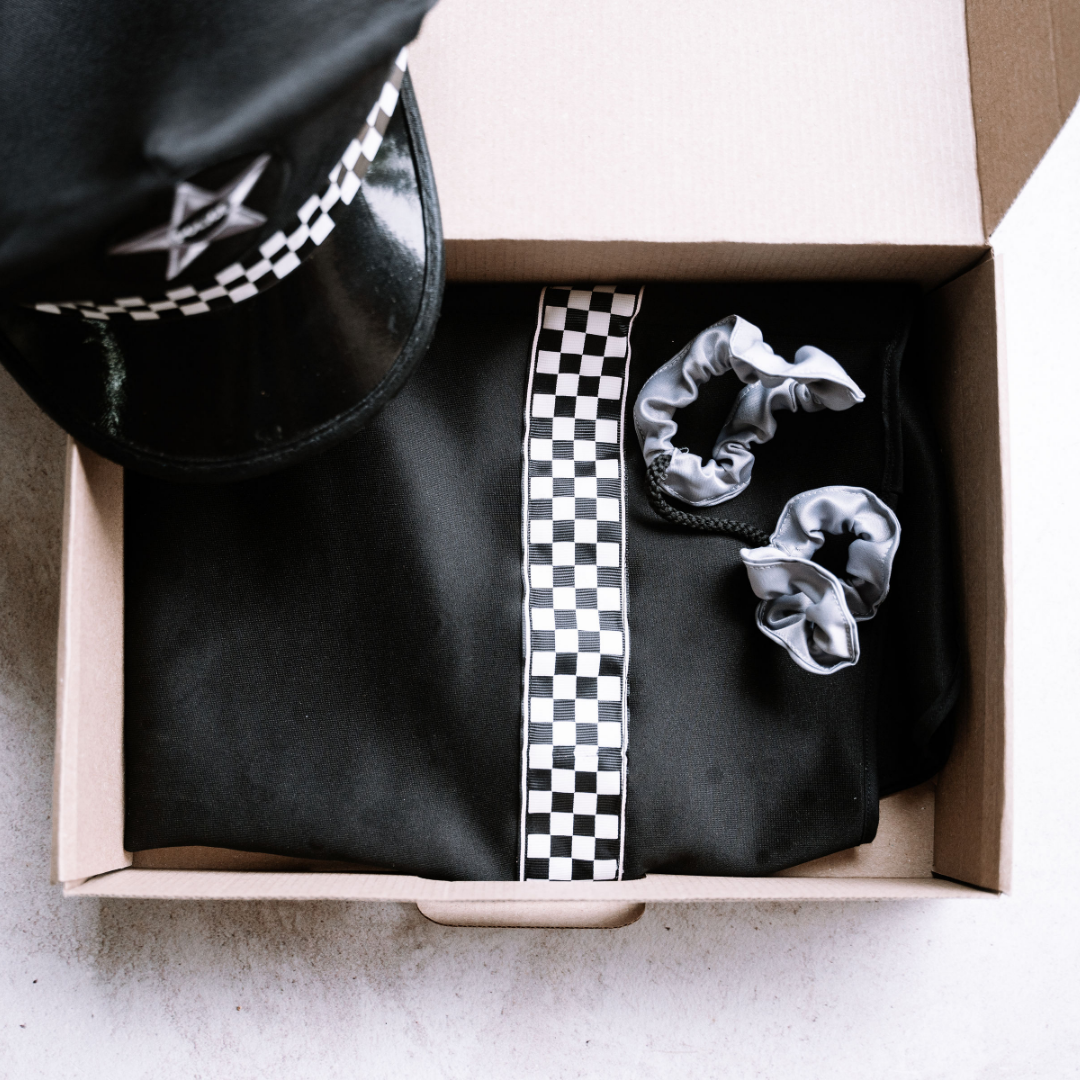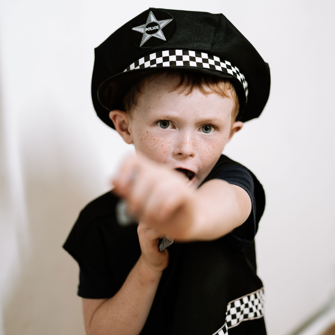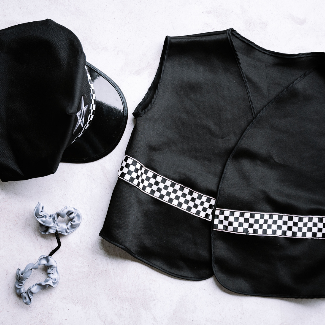 Handmade with high quality fabrics and finishes, our Policeman set includes a replica waistcoat, police hat and elasticated cuffs. One size fits all.